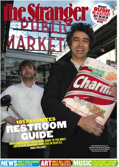 Seattle Weekly's annual guide to local restaurants hit the newsstands yesterday, followed less than 24 hours later by The Stranger's guide ... to Seattle restrooms. Notable because The Stranger's covers usually bear no relation to the paper's content. But look what we have here: a parody of The Weekly's cover. How'd they do that?