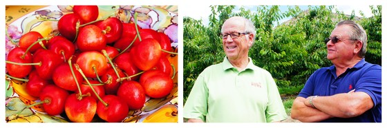 Brightly colored Orondo Ruby cherries, growers Griggs (r) and Clennon.