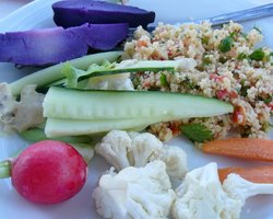 The vehicles shuttle our international delegation down to a grove where the family has set out the makings of lunch. Much amazement over the purple potatoes, but there's more: fresh crunchy vegetables from the markets of Provence (you never get enough fresh veggies on these trips), served with a hearty garlic mayonnaise and plenty of 2007 La Tourraque white. There's grilled salmon to follow, with creamed spinach, then a custard-filled cake and three more wines.